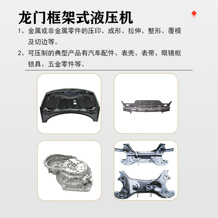 【產品描述】:30噸龍門框架式液壓機是一種高效、精準的壓力成型設備,廣泛應用于各種金屬、非金屬材料的壓制、成型和校正工藝中。其獨特的龍門框架設計和強大的液壓驅動系統,使其具有出色的穩定性和工作效率,成為現代工業生產中不可或缺的重要設備。 30噸龍門框架式液壓機采用高強度鋼材構建龍門式框架,保證了設備的穩固性和剛性。機身采用優質鋼板焊接而成,經過精細的熱處